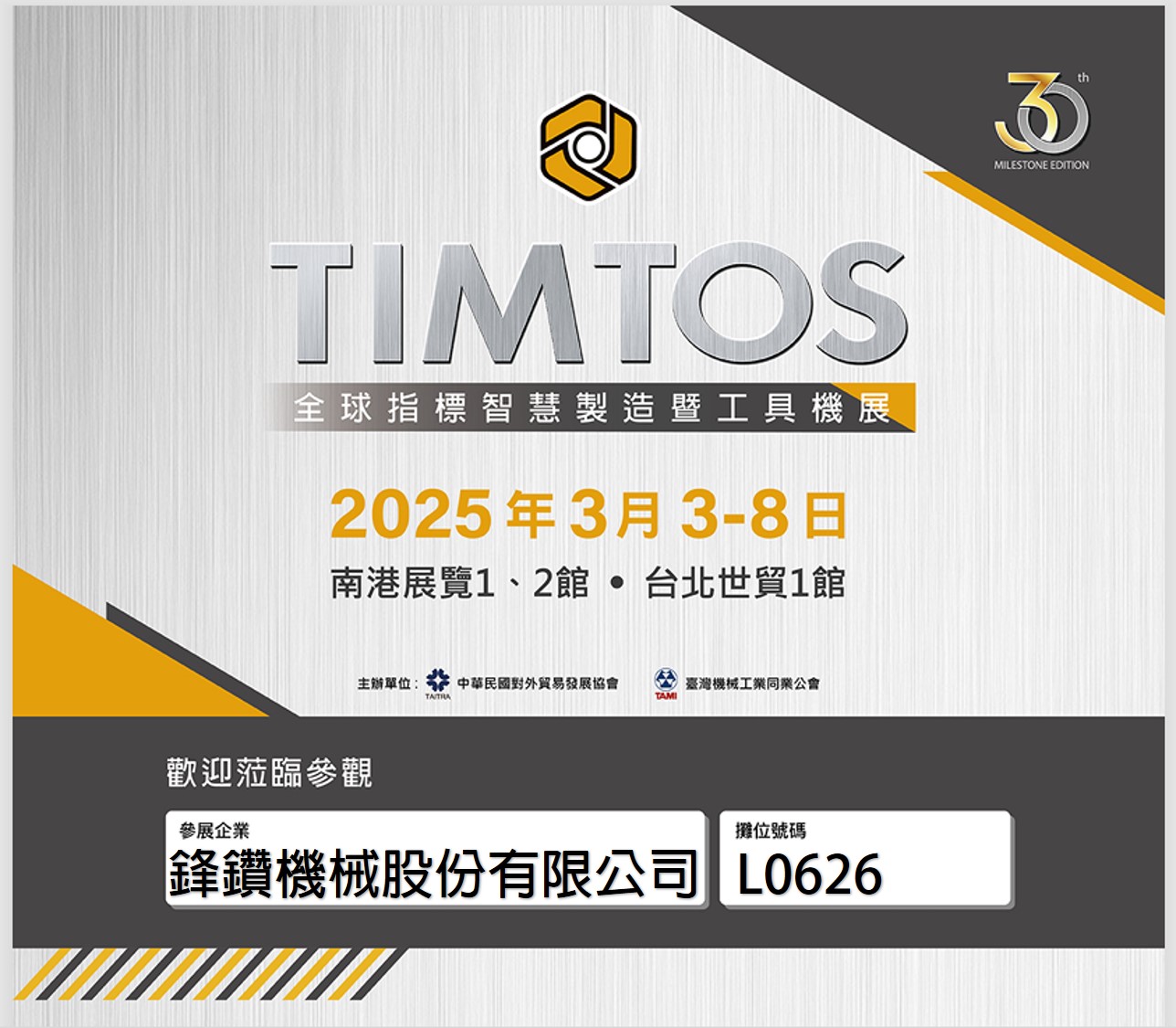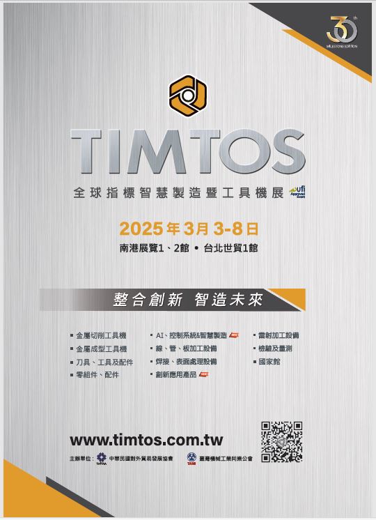 由外貿協會與機械公會共同主辦的 TIMTOS將於2025年3月3日至8日,在南港展覽館1、2館及台北世貿1館盛大登場,TIMTOS 為全球指標智慧製造暨工具機展,此次展覽總規模接近1,000家廠商,使用超過6,000個攤位,為台灣最具國際指標性的智慧製造暨工具機專業展。